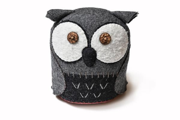 Our original stitch creation comes to life in a handmade witty and wooly flannel and red corduroy Grayers owl. Limited edition. Approximately 7" high.