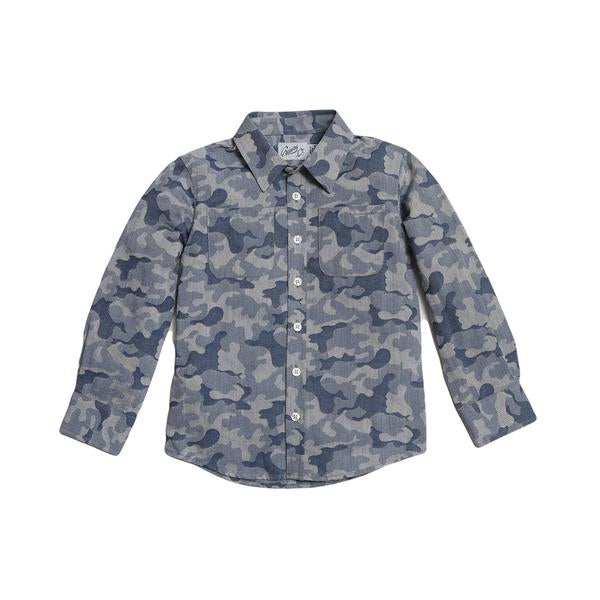Boys love camoflauge! Crafted in a rich weave of yarn dyed camo patterns in blue, gray and cream, it’s specially detailed with two patch pockets, a chambray trimmed placket, gussets and back yoke. To top it off, we stone washed it for a soft, weathered hand. 100% Cotton. IMPORTED.