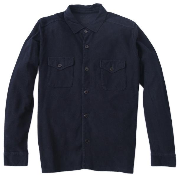 We always like to take classic items and rewrite them in new fabrics. Our version of the Chief Petty Officer shirt gets reinvented in navy heathered french terry. An ideal knit that transitions well from winter into spring and summer, it works well on its own with chinos or layers well over a henley or t-shirt. We specially trimmed the placket and inner cuffs with a tonal poplin fabric. It's finished with anchor buttons. 100% Cotton. IMPORTED.