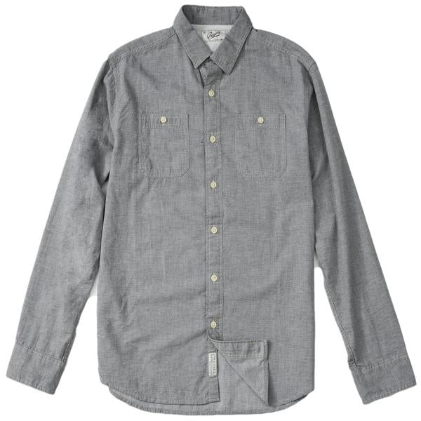 - Oatmeal heather herringbone twill lined placket, gusset and inside yoke