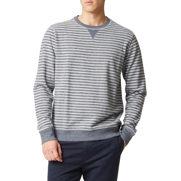 The athletic crew neck, re-designed and refined. A reverse french terry knitted in navy and gray heather stripes. Accented with a V-notch detail and trimmed with tonal heather rib. It works well over a white oxford with navy chinos or jeans. 100% Cotton. IMPORTED.
