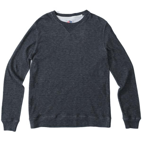 Sweatshirts get redefined by Grayers in our new favorite knit in a navy blue heather. We’re banking it will be your go to piece because it’s a new twist on the classic athletic sweat shirt. Our super soft and lightweight striped double knit is knitted with heather slub yarns in a thin tonal feeder stripe on the surface and backed with an oatmeal heather inner layer. Wear it on its own over a t-shirt or more refined with a button-down shirt and chinos or denim. It also works well layered under our unconstructed blazers.