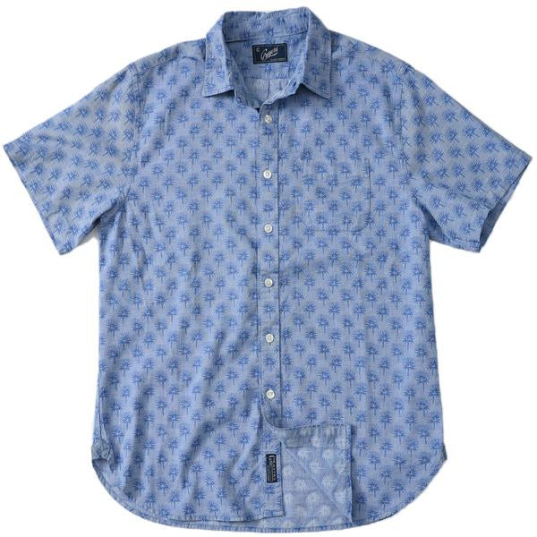 This is a special shirt. Maybe even the ultimate summer shirt. A unique vintage inspired shirt comes to life in a special blue robby weave with a palm tree motif. It has spring and summer written all over it. For a more refined look, team it with white chinos and a navy blazer, or go more casual with khakis or navy chinos, and with any color shorts for good summer vibes.